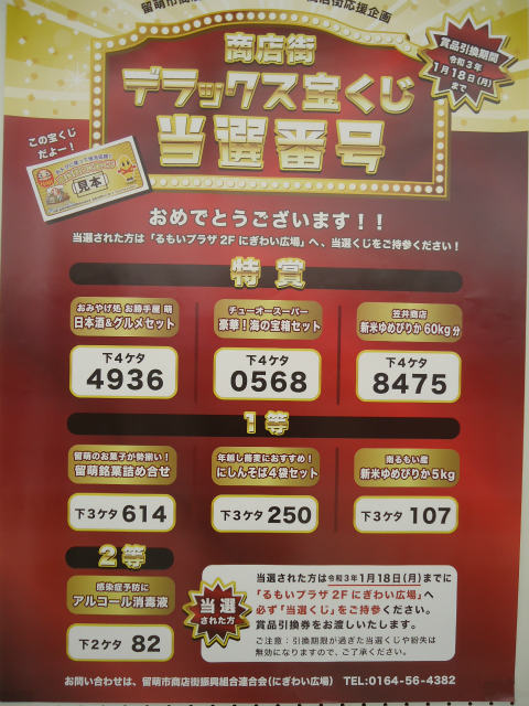 当選された方は、令和3年1月18日(月)までに「るもいプラザ2F にぎわい広場」へ必ず「当選くじ」をご持参ください。