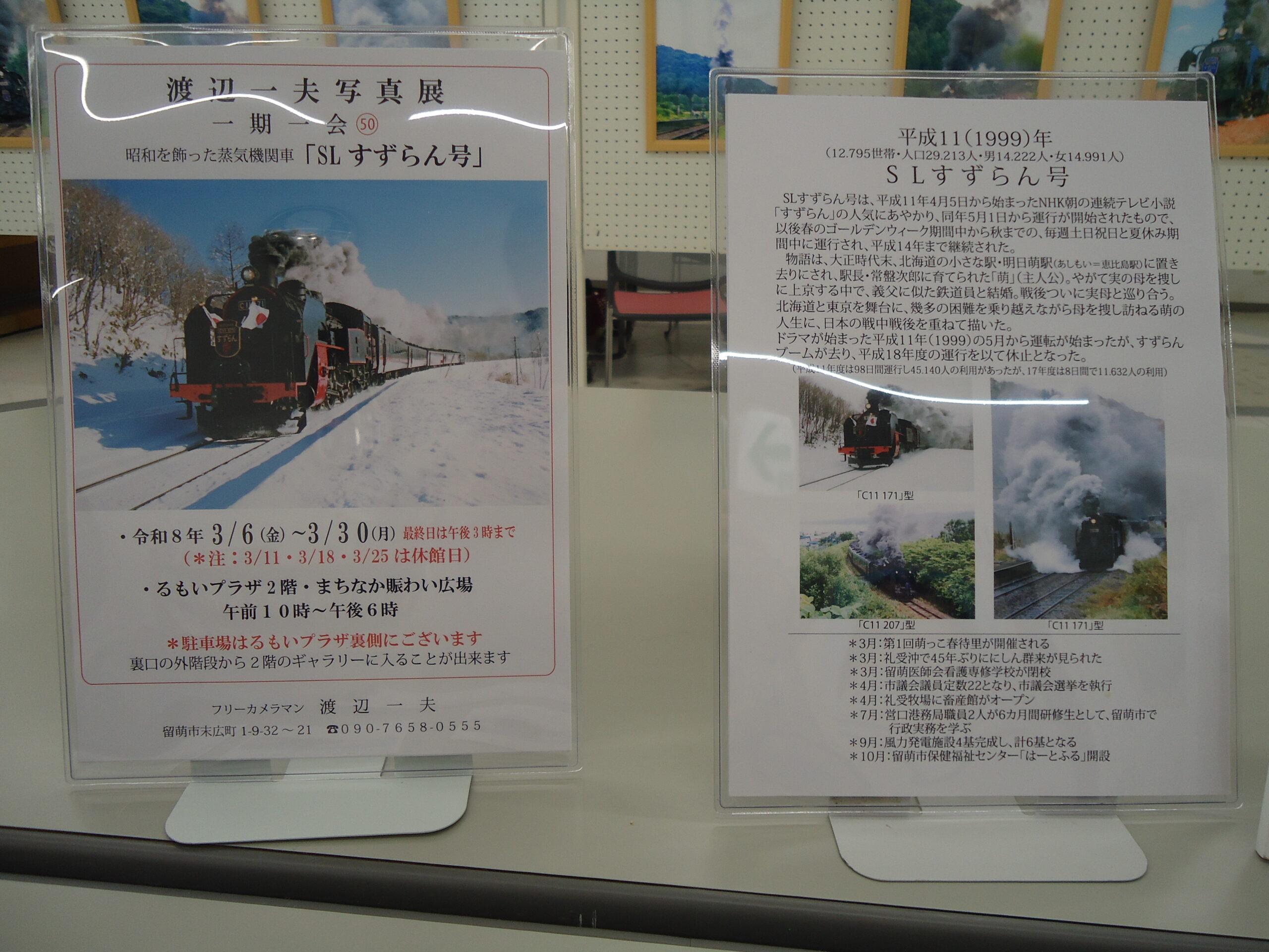 トップ › お知らせ一覧 › るもいプラザからのお知らせです るもいプラザからのお知らせです 渡辺 一夫様による写真展のお知らせです 一期一会㊵ 「昭和を飾った蒸気機関車 SLすずらん号写真展」 展示期間:令和8年3月6日(金)~3月30日(月) ※11日、18日、25日いずれも水曜日です 開館時間;午前10時~午後6時 (最終日の展示は午後3時まで) 展示場所:るもいプラザ2階 にぎわい広場 是非、ご覧にいらして下さい Twitter でシェア Facebook でシェア Google+ でシェア
